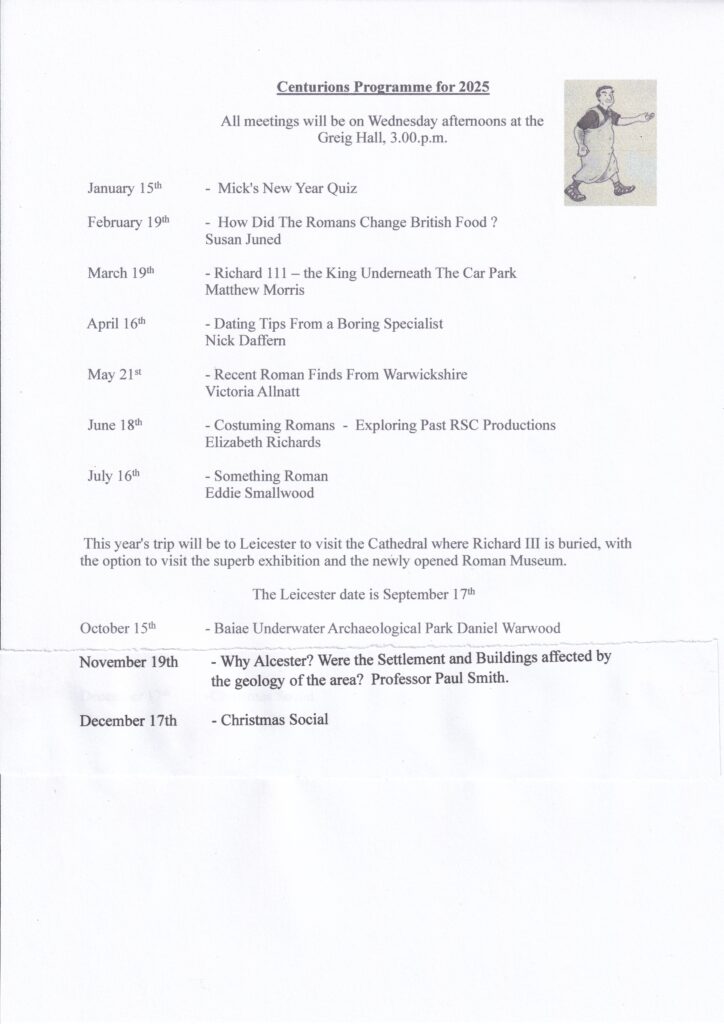 The Centurions’ annual programme of events enables the volunteers and supporters and everyone else with an interest to meet together once a month at the Greig Hall. If you have an interest in Roman history, particularly around the Alcester area, then please consider joining us.